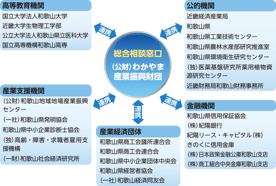 公益財団法人わかやま産業振興財団は、和歌山県の地域産業技術の振興を図るとともに、創業や中小企業等の技術及び経営の革新、新事業の創出など、様々な局面における技術開発、人材育成、市場開拓、資金調達など、県内企業の多様な活動を総合的に支援し、地域経済の発展に寄与することを目的に設立された中小企業総合支援機関です。